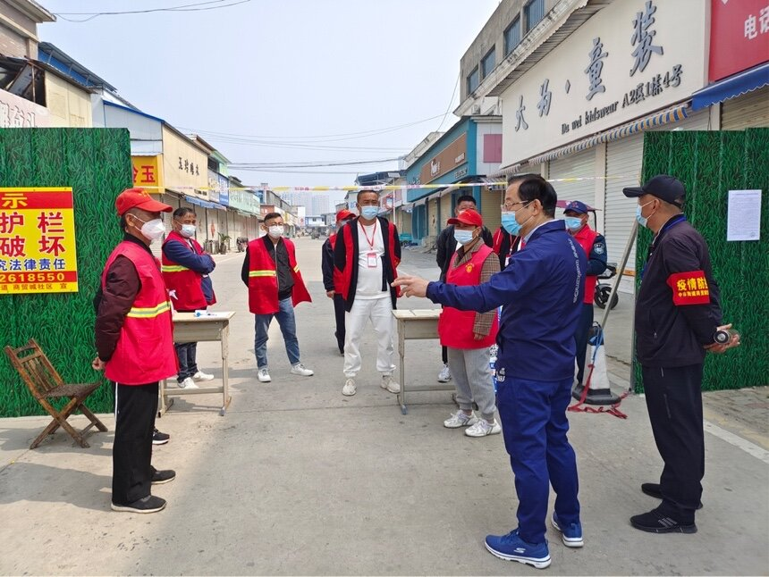 下沉社區(qū)后,田玉河和組員們第一時間熟悉商貿(mào)城市場基本情況,迅速進入戰(zhàn)時狀態(tài)。臨時黨支部黨旗飄揚,協(xié)助社區(qū)黨組織設(shè)立了疫情防控卡點、核酸檢測采樣點及黨員先鋒崗,各項工作有條不紊。