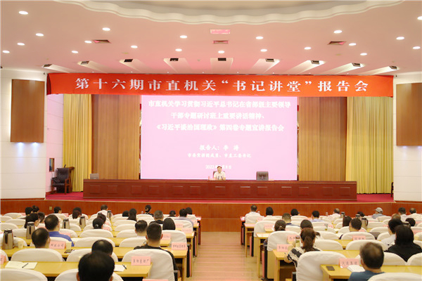 9月8日上午,市直機(jī)關(guān)學(xué)習(xí)貫徹習(xí)近平總書記在省部級主要領(lǐng)導(dǎo)干部專題研討班上重要講話精神、《習(xí)近平談治國理政政政》第四卷專題宣講暨第十六期市直機(jī)關(guān)“書記講堂”報(bào)告會在市政府一樓會議室舉辦,由市委宣講團(tuán)成員、市直工委書記李濤作報(bào)告。市直工委副書記劉智宏主持報(bào)告會。市直及中央、省駐阜直屬黨組織負(fù)責(zé)人和黨務(wù)干部,市直微宣講團(tuán)成員,市直工委黨員干部等近150人參會。