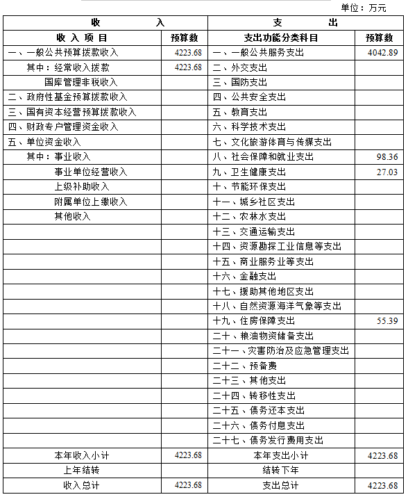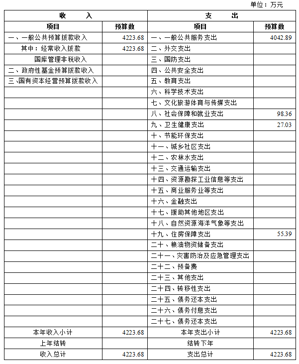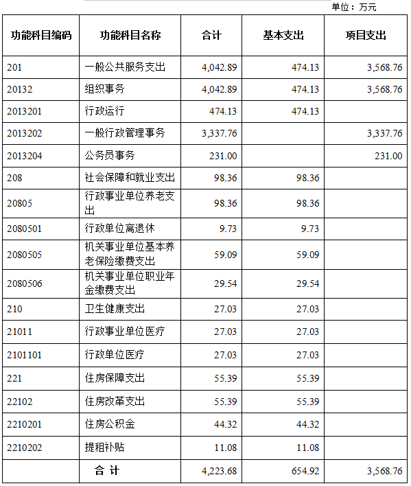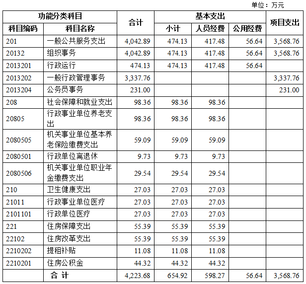 一般公共服務(wù)支出4042.89萬(wàn)元,占95.72%;社會(huì)保障和就業(yè)支出98.36萬(wàn)元,占2.33%;衛(wèi)生健康支出27.03萬(wàn)元,占0.64%;住房保障支出55.39萬(wàn)元,占1.31%。