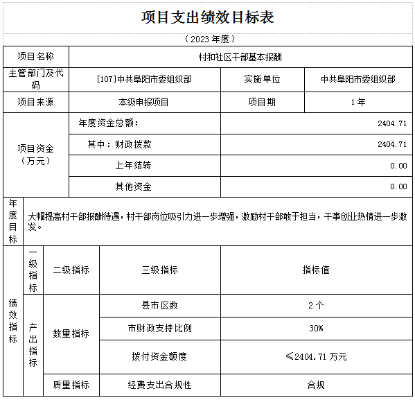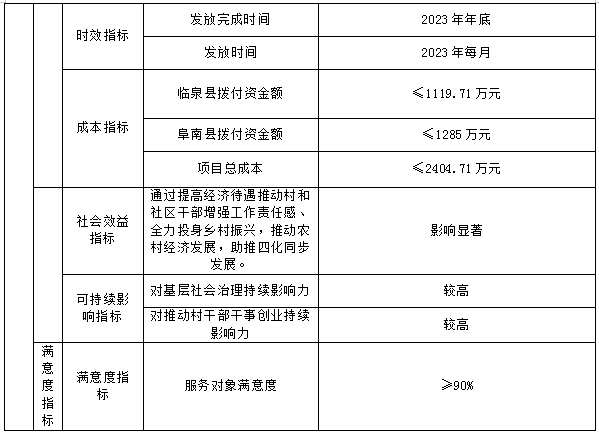 (1)項(xiàng)目概述。用于調(diào)整阜南縣、臨泉縣村和社區(qū)干部基本報(bào)酬,保障兩縣的村和社區(qū)干部基本報(bào)酬增加部分落到實(shí)處。
