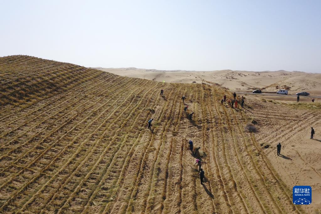 在甘肅省武威市古浪縣北部沙區(qū)旱麻崗治沙點(diǎn),八步沙林場治沙人和群眾一起扎草方格壓沙(2020年3月6日攝,無人機(jī)照片)。新華社記者 范培珅 攝