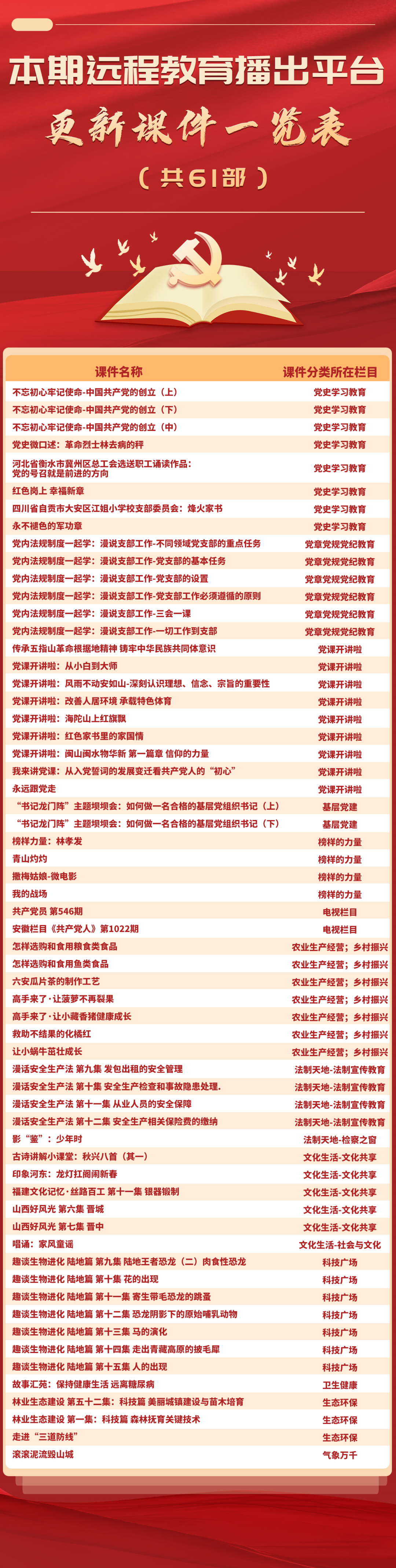 為進一步提升黨員遠程教育學(xué)用結(jié)合實效,幫助全省基層遠程教育終端站點更便捷地掌握課件資源庫內(nèi)容,省黨員電教中心將通過安徽先鋒微訊定期發(fā)布精品節(jié)目推薦以及最新上傳更新節(jié)目單,請通過遠程教育終端站點或安徽先鋒網(wǎng)-先鋒網(wǎng)視點播收看。