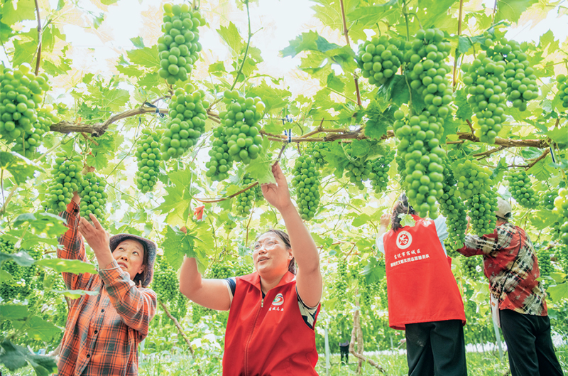 近年來(lái),江蘇省宿遷市宿城區(qū)支口街道大力實(shí)施黨建引領(lǐng)強(qiáng)村富民工程,采取“黨建+合作社+農(nóng)戶”運(yùn)作模式,組織黨員志愿者走進(jìn)田間地頭生產(chǎn)一線,引導(dǎo)群眾因地制宜發(fā)展山楂、葡萄等特色產(chǎn)業(yè)種植,拓寬增收渠道,助力鄉(xiāng)村振興。圖為2023年6月30日,在宿遷市宿城區(qū)支口街道探楚社區(qū)葡萄種植基地,黨員志愿者和果農(nóng)一起管護(hù)葡萄。
