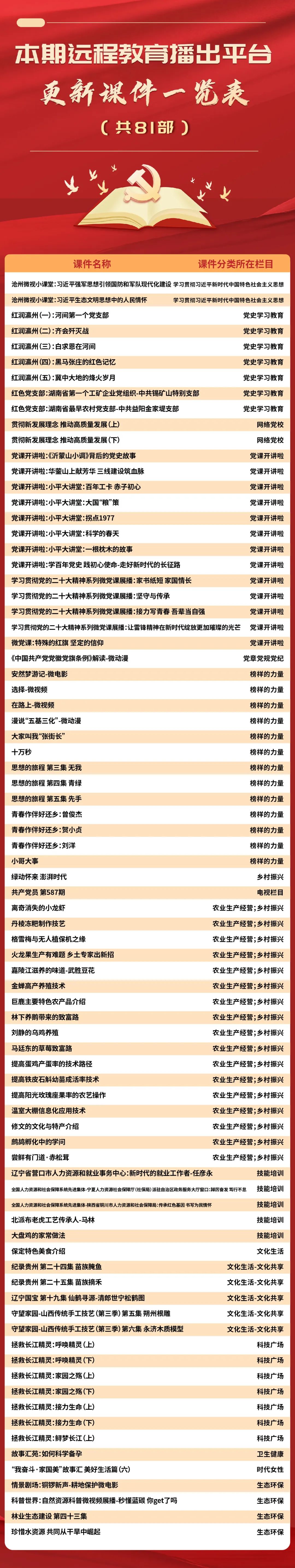 為進(jìn)一步提升黨員遠(yuǎn)程教育學(xué)用結(jié)合實(shí)效,幫助全省基層遠(yuǎn)程教育終端站點(diǎn)更便捷地掌握課件資源庫(kù)內(nèi)容,省委組織部黨員教育中心通過(guò)安徽先鋒微訊定期發(fā)布精品節(jié)目推薦以及最新上傳更新節(jié)目單,請(qǐng)通過(guò)遠(yuǎn)程教育終端站點(diǎn)或安徽先鋒網(wǎng)-先鋒網(wǎng)視點(diǎn)播收看。