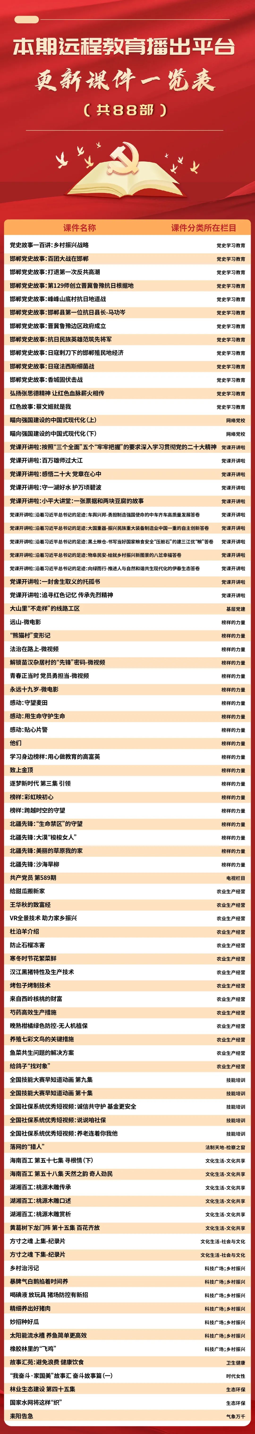 為進一步提升黨員遠程教育學用結合實效,幫助全省基層遠程教育終端站點更便捷地掌握課件資源庫內容,省委組織部黨員教育中心通過安徽先鋒微訊定期發(fā)布精品節(jié)目推薦以及最新上傳更新節(jié)目單,請通過遠程教育終端站點或安徽先鋒網-先鋒網視點播收看。
