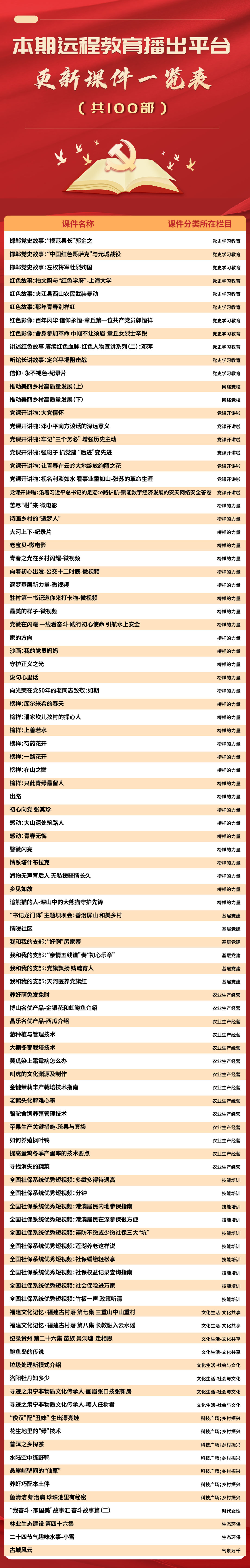 為進一步提升黨員遠程教育學(xué)用結(jié)合實效,幫助全省基層遠程教育終端站點更便捷地掌握課件資源庫內(nèi)容,省委組織部黨員教育中心通過安徽先鋒微訊定期發(fā)布精品節(jié)目推薦以及最新上傳更新節(jié)目單,請通過遠程教育終端站點或安徽先鋒網(wǎng)-先鋒網(wǎng)視點播收看。