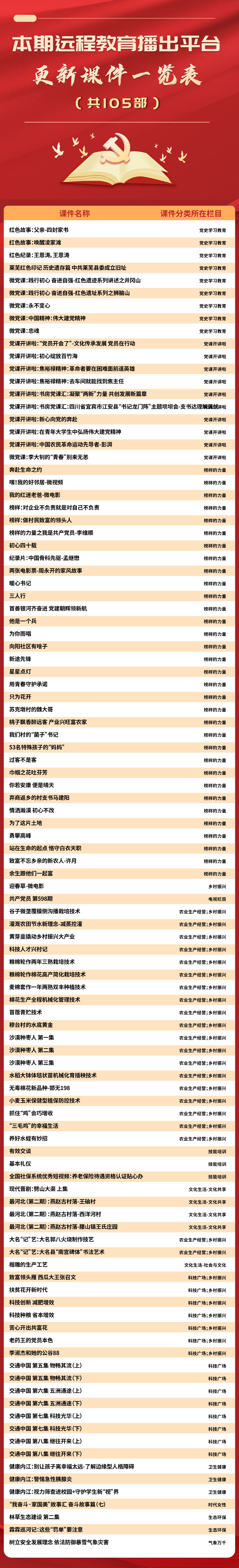 為進一步提升黨員遠程教育學(xué)用結(jié)合實效,幫助全省基層遠程教育終端站點更便捷地掌握課件資源庫內(nèi)容,省委組織部黨員教育中心通過安徽先鋒微訊定期發(fā)布精品節(jié)目推薦以及最新上傳更新節(jié)目單,請通過遠程教育終端站點或安徽先鋒網(wǎng)-先鋒網(wǎng)視點播收看。