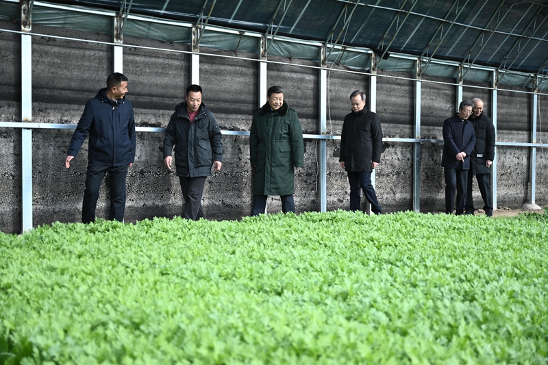 2月1日至2日,中共中央總書記、國(guó)家主席、中央軍委主席習(xí)近平來(lái)到天津,看望慰問(wèn)基層干部群眾。這是1日上午,習(xí)近平在西青區(qū)辛口鎮(zhèn)第六埠村實(shí)地察看去年洪澇災(zāi)害后當(dāng)?shù)剞r(nóng)業(yè)生產(chǎn)恢復(fù)等情況時(shí),走進(jìn)大棚看蔬菜長(zhǎng)勢(shì)。