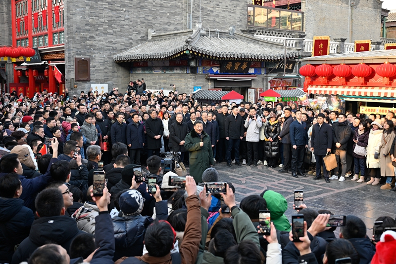 當(dāng)天下午,習(xí)近平來(lái)到天津古文化街。街道古色古香,習(xí)近平沿街步行,先后走進(jìn)桂發(fā)祥十八街麻花、果仁張、泥人張、楊柳青年畫等特色店鋪,了解產(chǎn)品種類、銷售和傳統(tǒng)文化傳承發(fā)展等情況,同店鋪業(yè)主、員工和現(xiàn)場(chǎng)群眾互動(dòng)交流。他說(shuō),各級(jí)黨委和政府要加強(qiáng)節(jié)日期間民生商品的產(chǎn)銷保供,確保數(shù)量充足、品類豐富、質(zhì)量可靠,讓廣大群眾放心消費(fèi)、快樂(lè)過(guò)年。習(xí)近平指出,中國(guó)式現(xiàn)代化離不開優(yōu)秀傳統(tǒng)文化的繼承和弘揚(yáng),天津是一座很有特色和韻味的城市,要保護(hù)和利用好歷史文化街區(qū),使其在現(xiàn)代化大都市建設(shè)中綻放異彩。