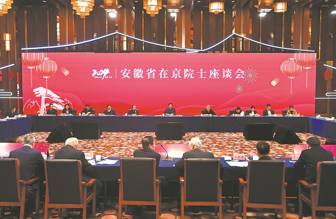 心系桑梓話鄉(xiāng)情,科技賦能謀發(fā)展。在新春佳節(jié)來臨之際,2月2日上午,安徽省在京院士座談會在北京召開,共話鄉(xiāng)情鄉(xiāng)誼、共商興皖強省大計,助力安徽在國家科技創(chuàng)新格局中勇?lián)谝环疥囀姑?,共同推動安徽在強國建設(shè)、民族復(fù)興偉業(yè)中作出新的更大貢獻。省委書記韓俊主持會議并講話。省委副書記、省長王清憲通報安徽省經(jīng)濟社會發(fā)展情況。34位中國科學(xué)院院士或中國工程院院士參加座談會,省政協(xié)主席唐良智,省委副書記、合肥市委書記虞愛華,省領(lǐng)導(dǎo)張韻聲、丁向群、費高云、張紅文、任清華、羅平出席。