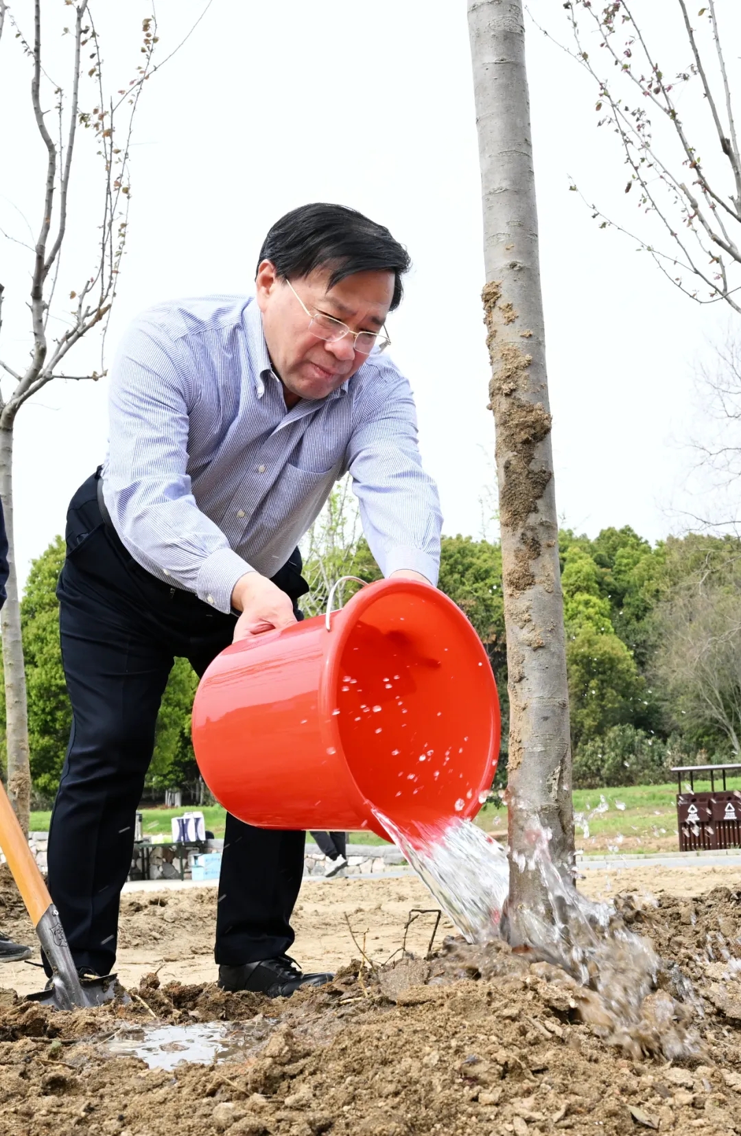 隨后,韓俊等省領(lǐng)導(dǎo)拿起鐵鍬走向植樹地點,同現(xiàn)場的干部群眾一起,將一棵棵樹苗植入樹坑。大家揮鍬鏟土、培土圍堰、提水澆灌,經(jīng)過一番忙碌,一排排新栽下的廣玉蘭、桂花、紫薇、海棠等樹種,在和煦的春風中昂然挺立,孕育著勃勃生機,煥發(fā)出綠色希望。植樹過程中,韓俊對植樹造林工作提出明確要求。他說,植樹造林功在當代、利在千秋。要扎實開展全民義務(wù)植樹,合理優(yōu)化國土綠化格局,持續(xù)提高造林綠化質(zhì)量,鞏固和增強生態(tài)系統(tǒng)碳匯能力,不斷提升生態(tài)系統(tǒng)多樣性、穩(wěn)定性、持續(xù)性,切實把好山好水保護好。各級領(lǐng)導(dǎo)干部要帶頭抓好國土綠化和生態(tài)文明建設(shè)各項工作,大力營造愛綠、植綠、護綠的文明風尚,帶動更多干部群眾爭做生態(tài)文明建設(shè)的實踐者、推動者,共同種出屬于大家的綠水青山和金山銀山,繪出人與自然和諧共生的美麗安徽新畫卷。