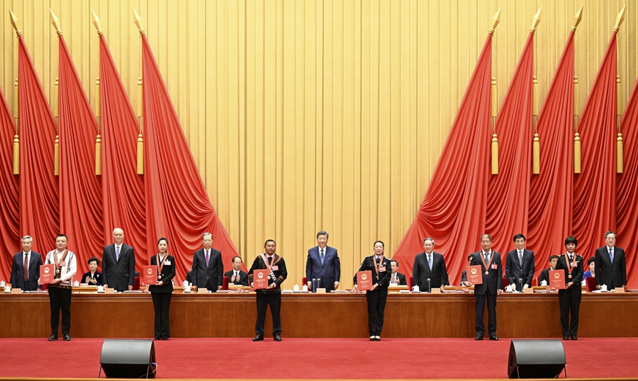在歡快的樂曲聲中,習(xí)近平等為受表彰的模范個人和模范集體代表頒獎。