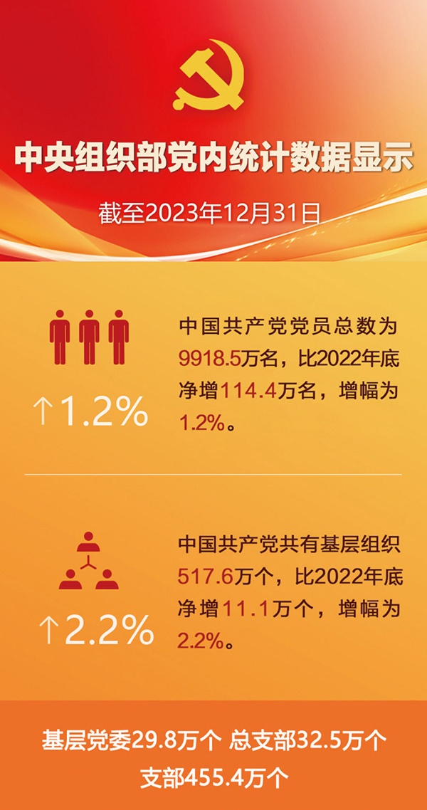 中央組織部2024年6月黨內(nèi)統(tǒng)計(jì)數(shù)據(jù)顯示:截至2023年底,中國共產(chǎn)黨黨員總數(shù)為9918.5萬名,比上年凈增114.4萬名。黨的基層組織517.6萬個(gè),比上年凈增11.1萬個(gè)。中國共產(chǎn)黨堅(jiān)持大抓基層的鮮明導(dǎo)向,持續(xù)強(qiáng)基固本、補(bǔ)齊短板弱項(xiàng),不斷嚴(yán)密上下貫通、執(zhí)行有力的組織體系,全面加強(qiáng)黨員隊(duì)伍建設(shè),充分發(fā)揮基層黨組織戰(zhàn)斗堡壘作用和黨員先鋒模范作用,使黨始終保持旺盛生命力和強(qiáng)大戰(zhàn)斗力。